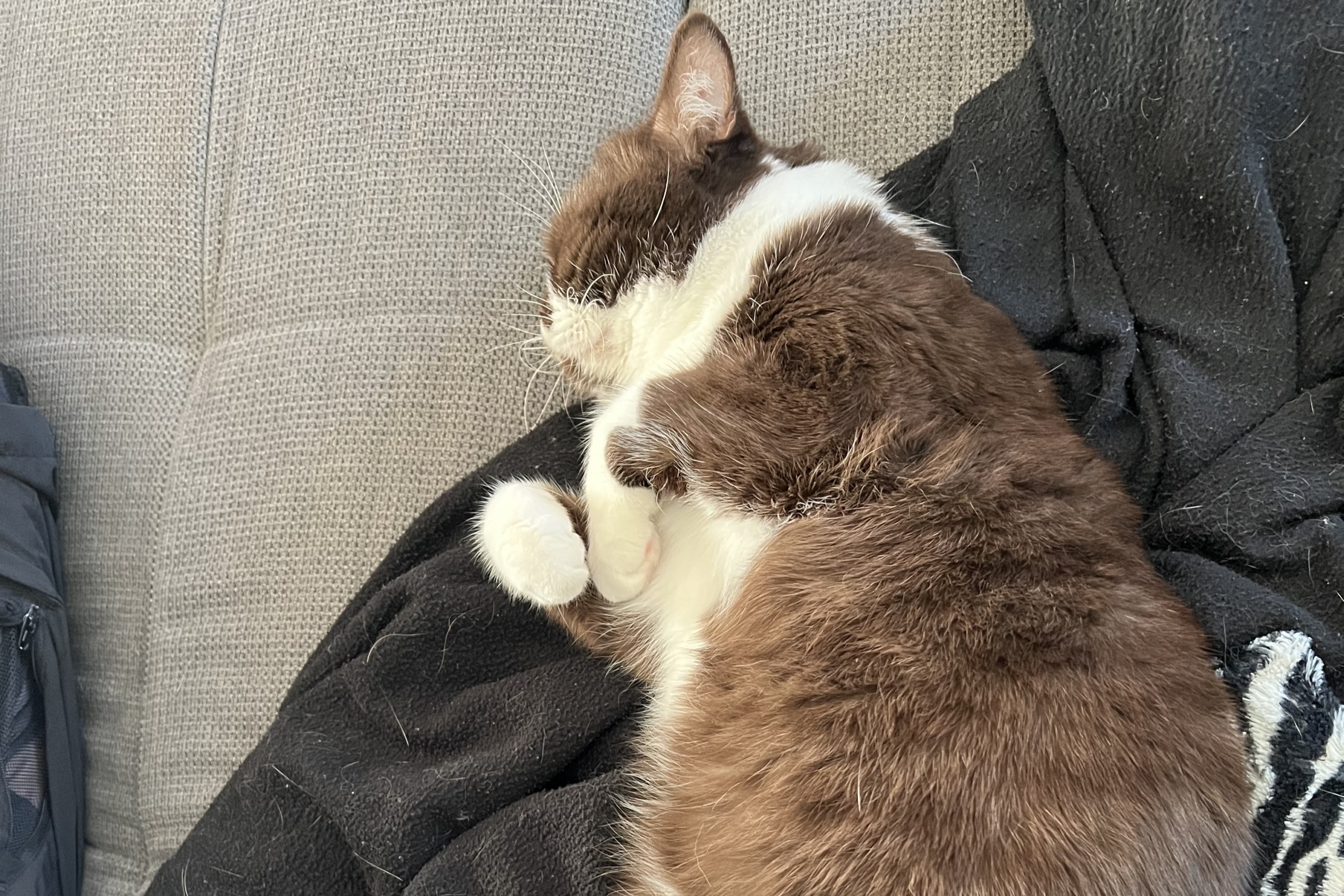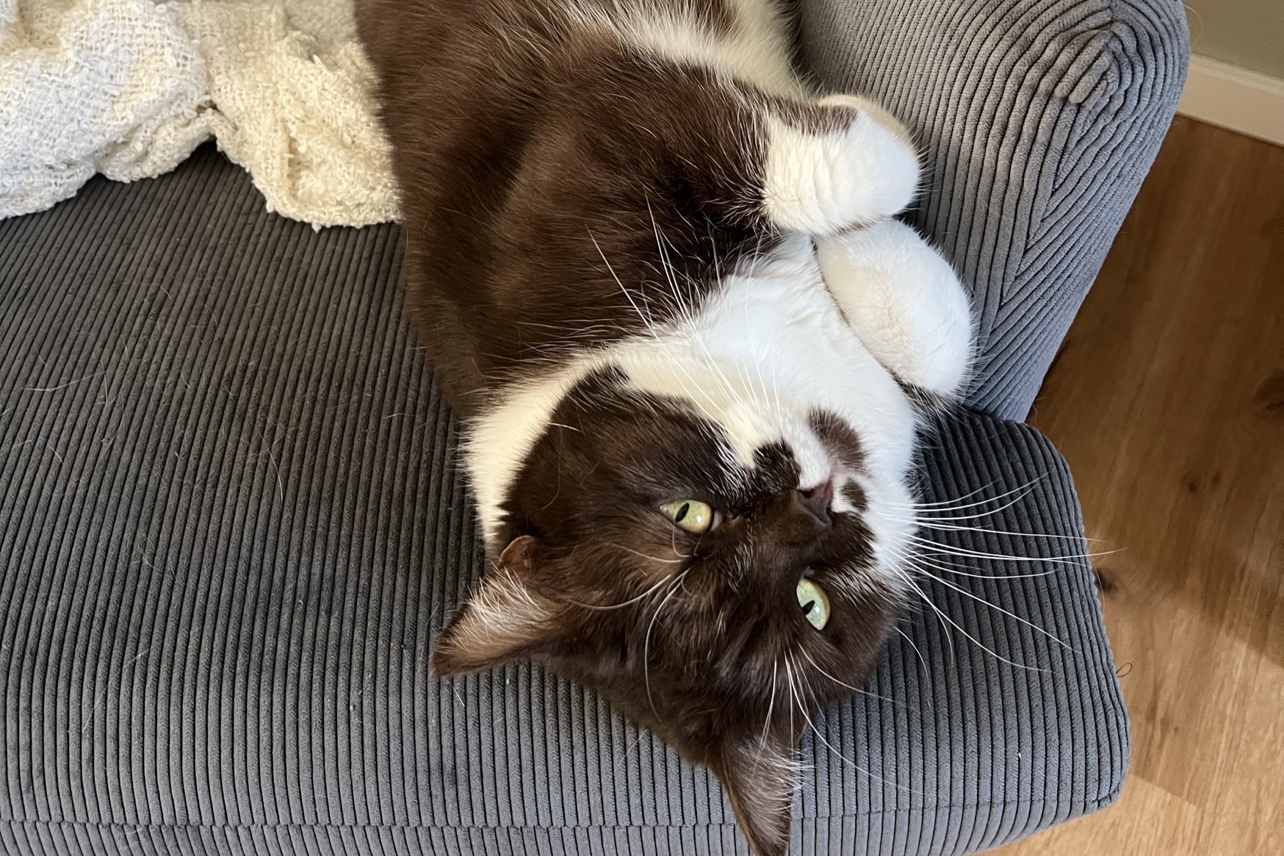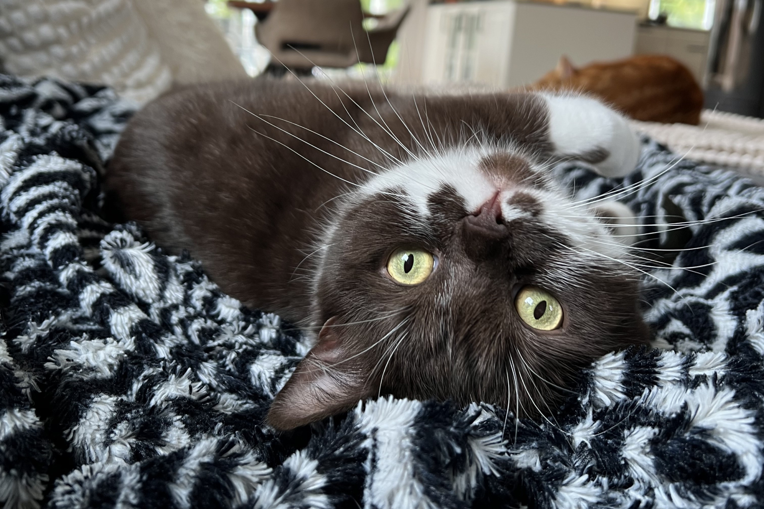 In den ersten Wochen hat er sich noch viel versteckt und war sehr ängstlich, aber inzwischen ist er richtig aufgeblüht. Er versteht sich super mit unserem Kater Roli und freut sich sichtlich, wenn dieser reinkommt – die beiden spielen jeden Tag miteinander.