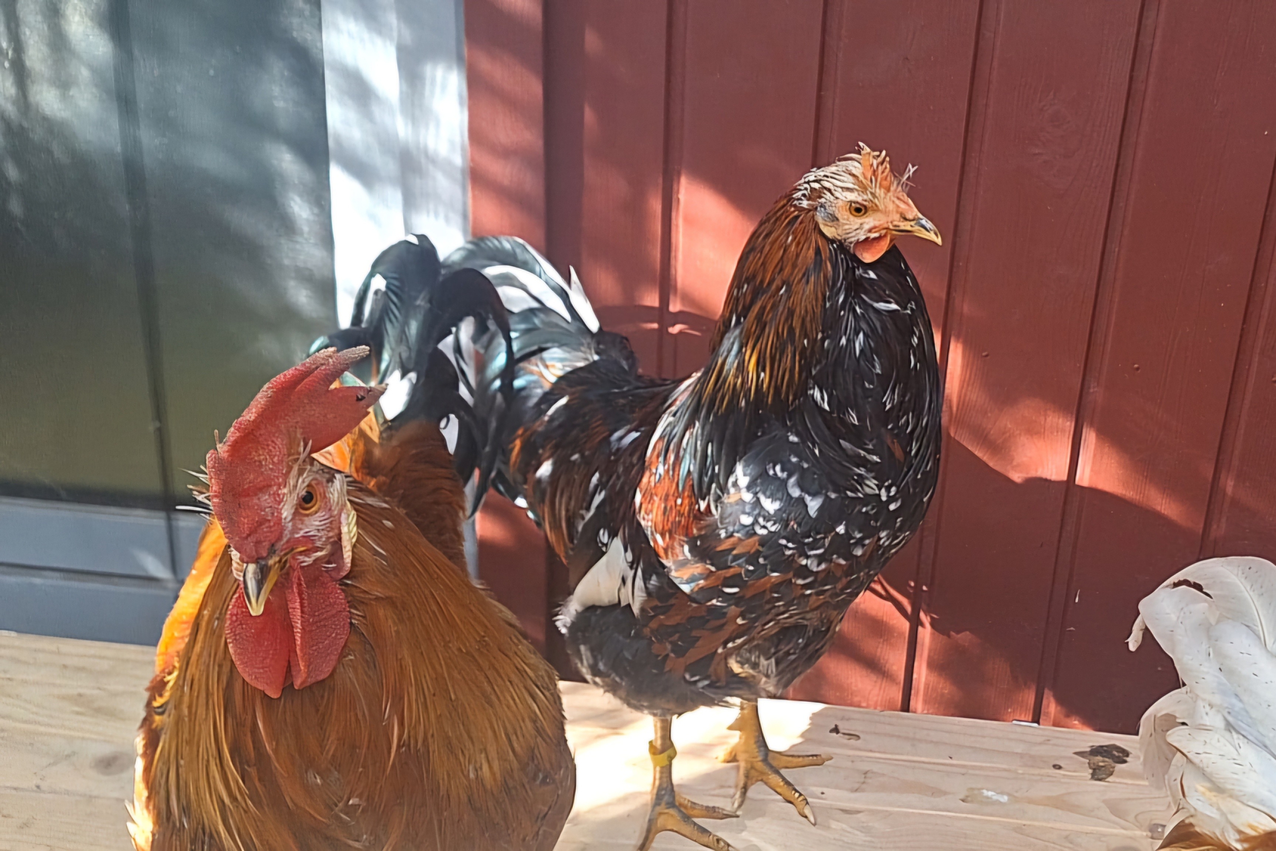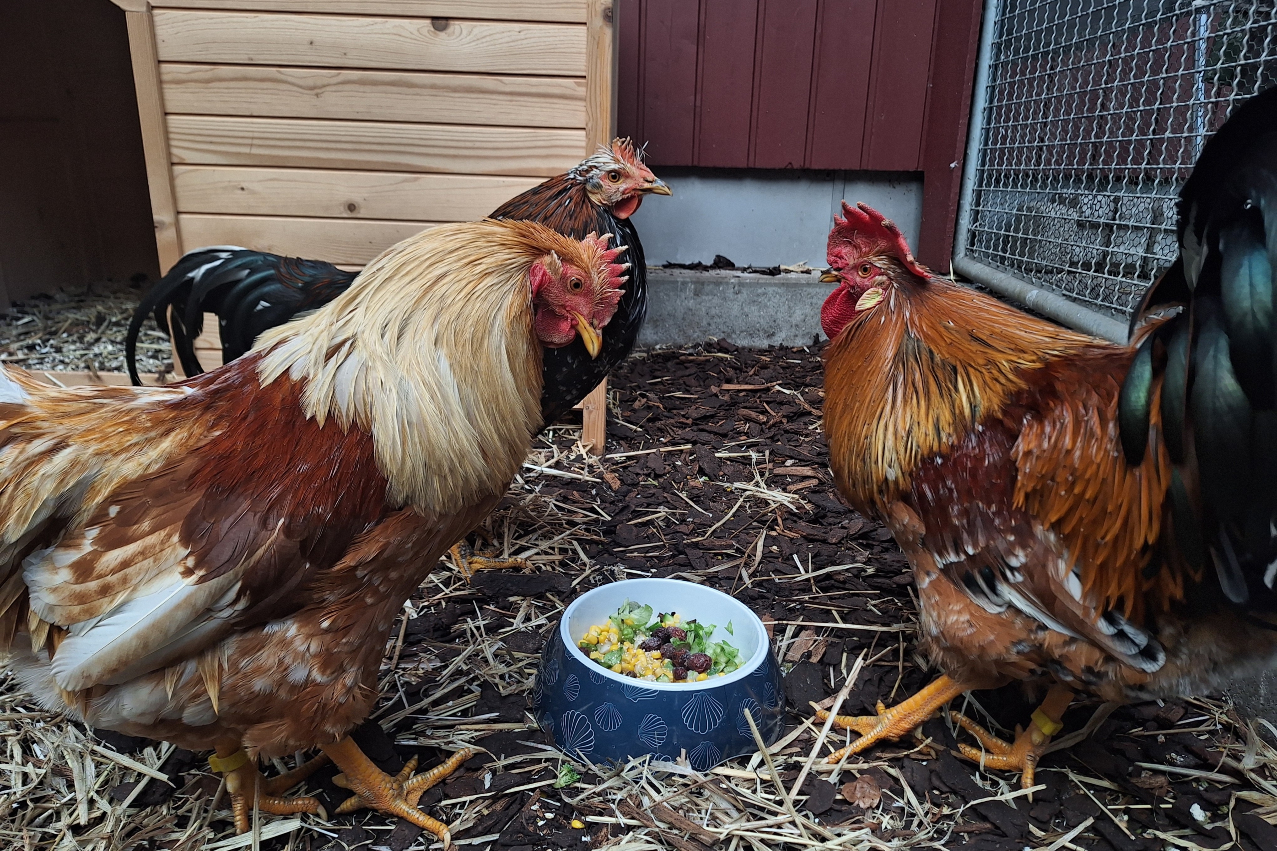Xaver (hellbraun), Egon (schwarz-weiß) und Edgar (bunt) kamen im Kükenalter als Tierschutzfall zu uns ins Tierheim. Mit ihren 14 Geschwistern wurden sie in einer Dusche gehalten und sollten von dort aus verkauft werden. Im Tierheim durften sie sich erholen, natürlichen Boden unter den Füßen spüren und zu richtig schönen selbstbewussten Hähnen heranwachsen. Während ihre Schwestern nach und nach in ihre Traumzuhause ausziehen durften, mussten die Brüder weiter abwarten und Tee trinken (wohl Melwürmer picken😉). Jetzt wird es aber langsam Zeit für unsere Jungs in ein richtiges eigenes Zuhause zu ziehen.